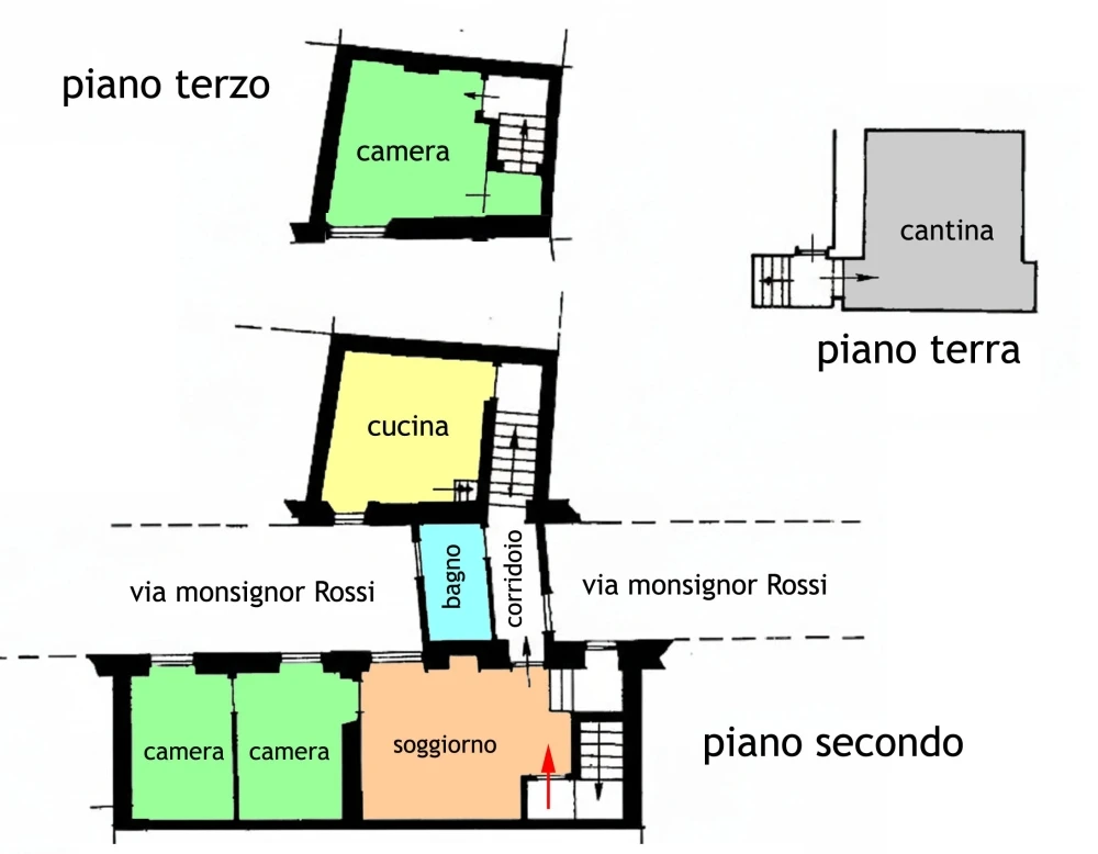 L’ingresso è indipendente, tramite scala privata che conduce direttamente al soggiorno. Dal soggiorno, sul lato sinistro, si accede a due camere da letto, di cui una passante; sul lato destro è presente un piccolo spazio adibibile a ripostiglio. Frontalmente all’ingresso si sviluppano un corridoio e il bagno, entrambi collocati sopra l’arco.