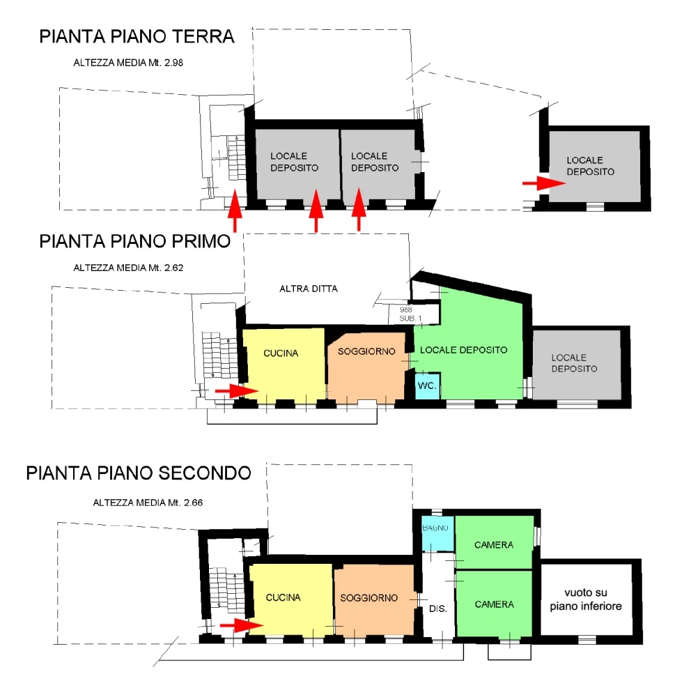 Al Piano Terra 3 magazzini di proprietà (il primo di 20 mq, il secondo di 16 mq e il terzo di altri 21 mq) più un quarto magazzino al centro in comune con altra famiglia.
